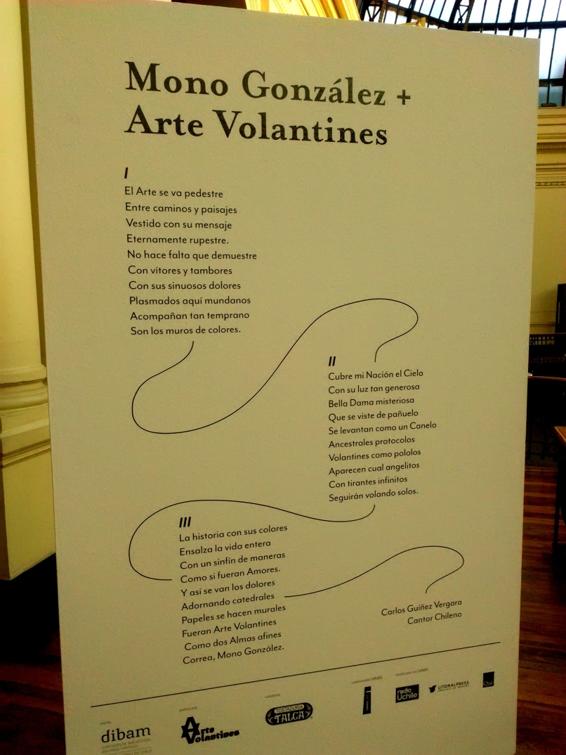 Mono González: Aquí hay algo importante, el trabajo que me orienta y me motiva es cómo de alguna manera lo popular nutre a lo académico. Me acuerdo de Violeta Parra, por ejemplo. Tenemos ese prejuicio que lo académico es solo lo válido y lo otro no lo es. Y justamente lo otro es muy válido porque es lo que construye identidad y construye cultura, mestiza, que se relaciona con muchas otras culturas, etc. Hoy día hay un patrimonio de mural nuestro en el extranjero, pero porque hay una identidad reconocible afuera, en estilo, y que tiene que ver con lo latinoamericano. También poner acento en los volantines, la materialdiad y fragilidad de la materia y estos vitrojos de colores que estan ahí intercalados. La fragilidad de los muros nuestros, los terremotos, las cosas bélicas. De la tristeza de la dureza de la vida sacamos lo contrario, nos nutrimos con eso. Recuerdo la Lira Popular al ver los volantines colgados con los cordeles.